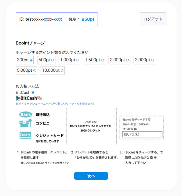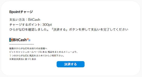 コンビニやクレジットカーで購入したBitCashからBpointのチャージができます。