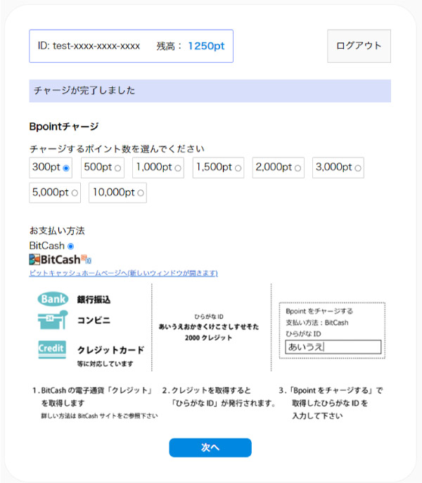 チャージする金額と支払方法を選択して、「次へ」を押してください